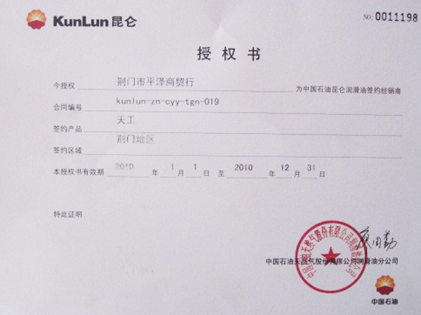 昆侖潤滑油授權(quán)書