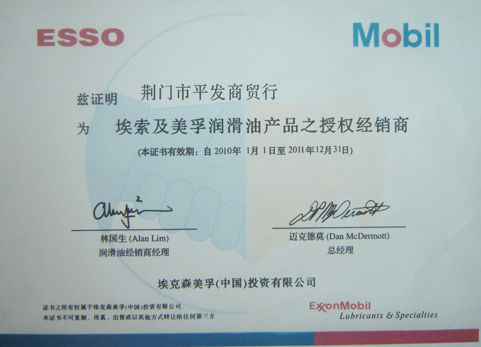 美孚潤滑油授權(quán)書